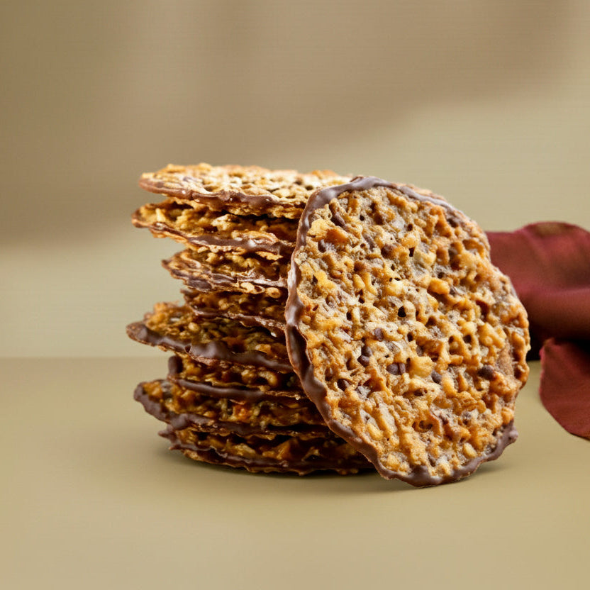 Experience the delicate crunch of our signature Lace Cookies. These caramelized, paper-thin treats offer a sophisticated snap and a deep, toffee-like flavor that melts on the tongue. A rarity in the UAE, they are the perfect light accompaniment to your afternoon coffee or a stand-alone indulgence.
